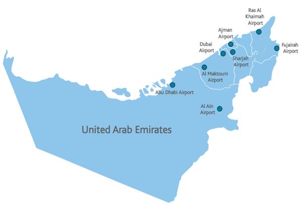 Mapa: Aerodromi u Ujedinjenim Arapskim Emiratima