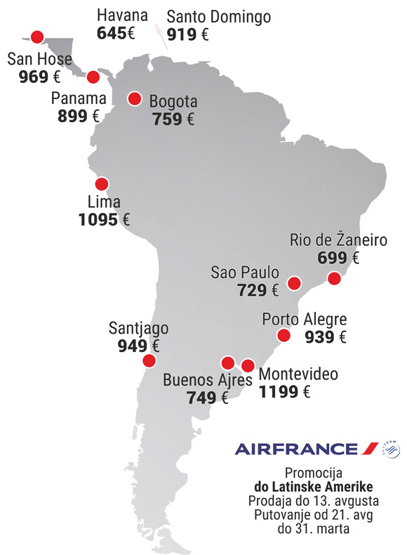 Brazilski gradovi su najuzbudljiviji deo promotivne ponude, za Rio de Žaneiro karta košta samo 699 evra, Sao Paolo je 729 evra.i Buenos Ajres je na promociji 749 evra, Santjago je 949 evra.