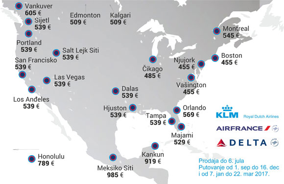 U saradnji sa našom Air Serbijom ove kompanije povezale su Beograd sa svim američkim i kanadskim gradovima. Možete putovati preko Pariza, Amsterdama ili Brisela, ali i preko Rima ili Milana, preko Frankfurta, Diseldorfa ili Štutgarta.