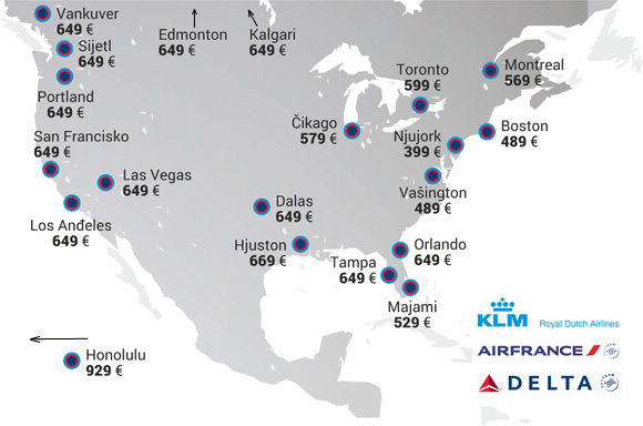 Air France / KLM i Delta alijansa su ponudili cene za putovanje do gradova u Sjedinjenim Državama i Kanadi. U pitanju su redovne cene za putovanja koja započinju u drugoj polovini avgusta, u septembru, oktobru ili novembru.