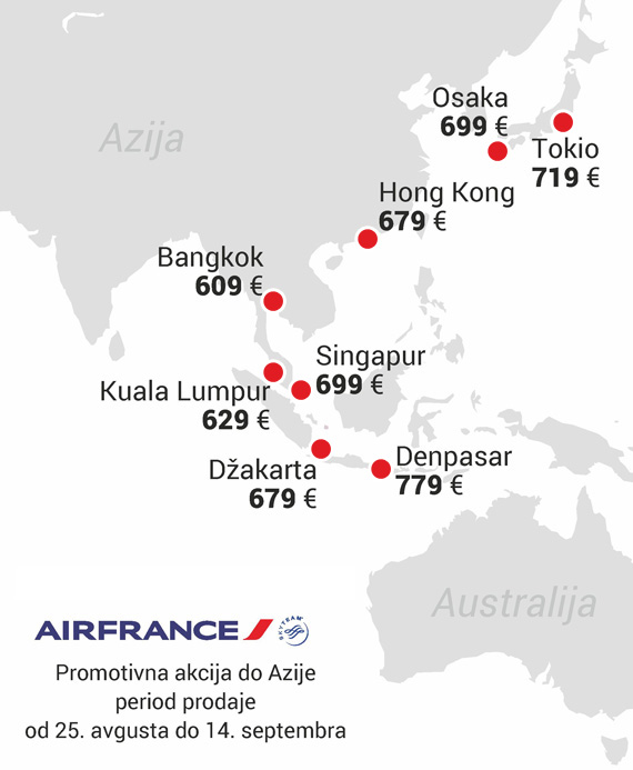 I sa Azijom je fantastična situacija – Bangkok košta 609 evra, Kuala Lumpur 629 evra, Džakarta i Hong Kong su po 679 evra, Denpasar je takođe 679 evra, dok je povratna karta iz Beograda do Singapura 699 evra. Do svih gradova stiže se direktnim letovima iz Pariza.