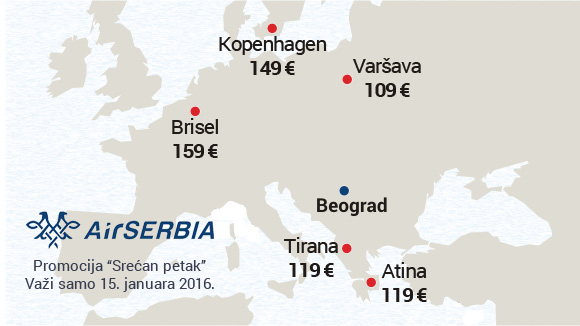 Nova jednodnevna promotivna akcija Air Serbije, poznata pod imenom "Srećni petak" je objavljena za 15. januar..