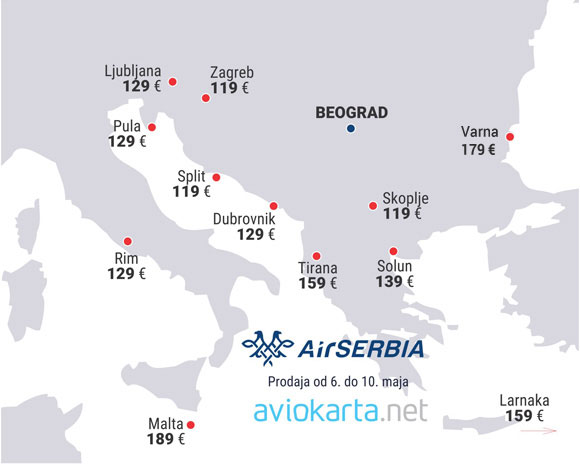Promocija donosi nešto povoljnije cene, koje se kreću od 119 evra za Split, Zagreb i Skoplje. Pula, Dubrovnik, Ljubljana i Rim su 129 evra.