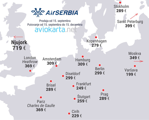 Dve povratne karte u ekonomskoj klasi do Ciriha i Beča su 229 evra, do Brisela, Praga i Štokholma 289 evra, do Berlina 299 evra, do Amsterdama 309 evra, do Moskve 349 evra, do Pariza i Londona 389 evra.