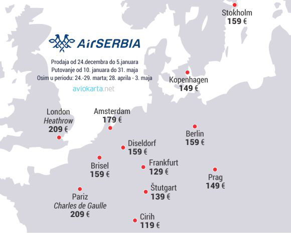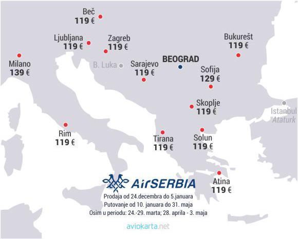 Promotivna akcija donosi vrlo povoljne cene aviokarata u ekonomskoj klasi Air Serbije, koje se kreću već od 119 evra koliko koštaju karte do Zagreba, Beča, Ljubljane, Sarajeva, Bukurešta, Skoplja, Rima, Atine, Soluna, Ciriha i Tirane.