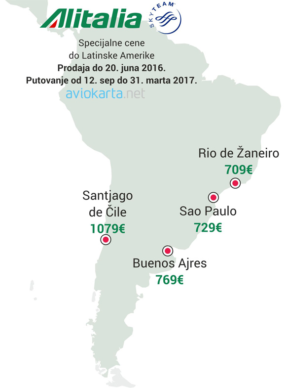 Alitalia je započela promotivnu prodaju za 4 najvažnija grada Južne Amerike. Putnici iz Srbije mogu leteti do Brazila, Čilea ili Argentine sa presedanjem na aerodromu u Rimu uz mogućnost da koriste i letove Air Serbije između Beograda i Rima.
