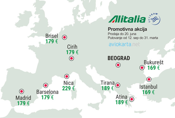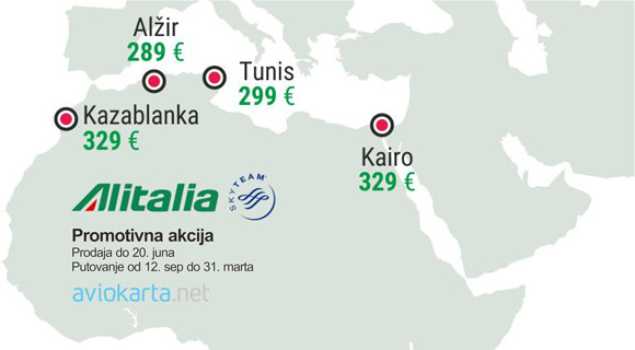 Alitalia je objavila promociju za gradove Evrope i Severne Afrike. Promotivna prodaja će trajati do 20. juna, a odnosi se na putovanja u periodu od 12. septembra do 31. marta. U tom periodu treba da se započne i završi putovanje. Maksimalni boravak po promotivnoj ceni je ograničen na 1 mesec.