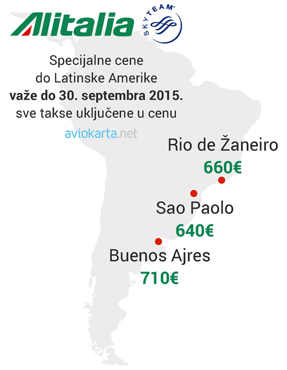 Alitalia je započela promotivnu prodaju za 3 najvažnija grada Južne Amerike. Putnici iz Srbije mogu leteti do Brazila ili Argentine sa presedanjem na aerodromu u Rimu uz mogućnost da koriste i letove Air Serbije između Beograda i Rima.