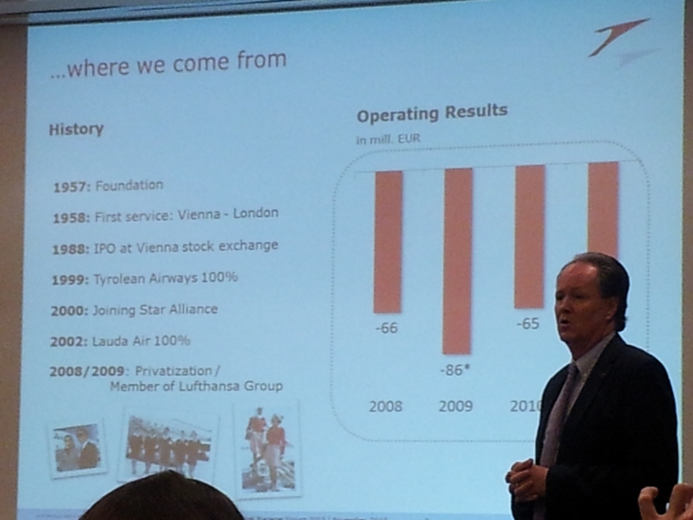 Austrijski nacionalni avioprevoznik se nalazi u ozbiljnoj finansijskoj krizi od 2008, a od prošle godine se primenjuje veoma strog plan restruktuiranja koji je ovu kompaniju posle samo dve godine vratio iz minusa u plus.
