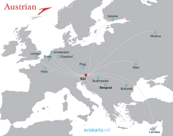 Nove najniže cene Austrian Airlines-a: Moskva od 165 evra, Bukurešt od 167 evra, Kijev od 171 evra, Diseldorf od 173 evra, Amsterdam od 175 evra, London, Pariz i Prag od 177 evra, Budimpešta od 179 evra, Larnaka od 180 evra, Brisel od 191 evra, Helsinki od 199 evra.