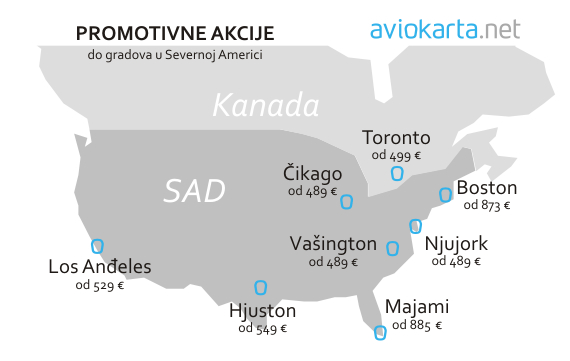 Povratne karte do Njujorka, Čikaga, Vašingtona, Toronta je 519 evra, a do Hjustona i Los Anđelesa 559 evra. Ovde možete pogledati detalje promocije.