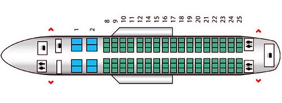 Ilustracija: Šematski prikaz putničke kabine aviona koji nema označen 13. red, (c) seatguru.com