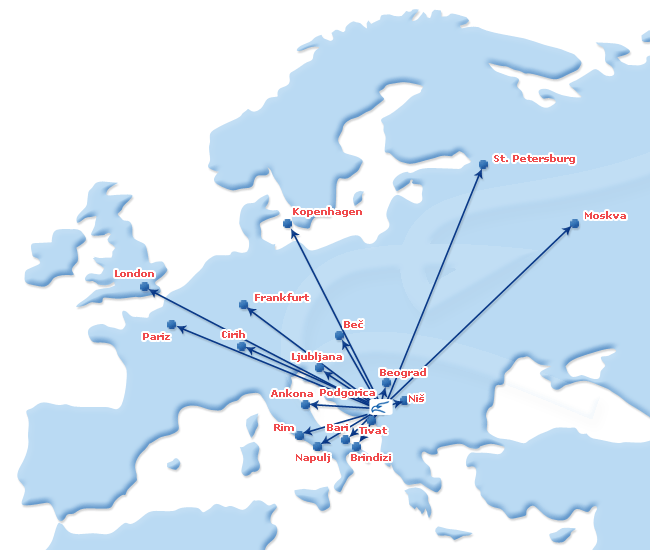 Međutim uz istu cenu aviokarte kao do Podgorice Nišlije mogu da lete i do svih naših destinacija: Londona, Pariza, Rima, Frankfurta, Ciriha i Moskve (mapa desno)