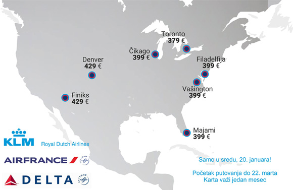 U saradnji sa našom Air Serbijom ove tri kompanije povezale su Beograd sa svim američkim i kanadskim gradovima. Možete putovati – najčešće – preko Pariza, Amsterdama ili Brisela, ali i preko Rima ili Milana, preko Frankfurta, Diseldorfa ili Štutgarta. Ogromna mreža linija vam omogućava da skoro uvek vaš agent može da za vas pronađe ovde prikazane najpovoljnije cene.