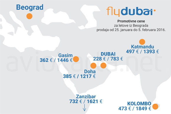 Tokom ove promocije najjeftinija redovna cena povratne karte u ekonomskoj klasi do Dubaija je 228 evra, do Dohe 385 evra, dok je Katmandu 497 evra a Kolombo na Šri Lanki je 473 evra.