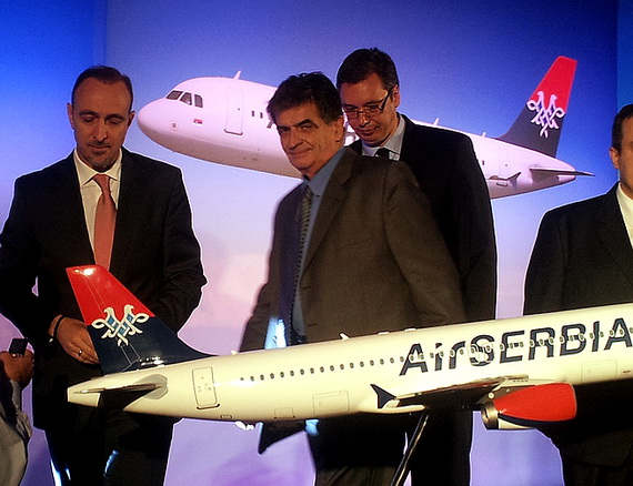 Foto: Budući direktor Air Serbia Deni Kondić (levo) i sadašnji v.d. direktor Jat Airways-a Velibor Vukašinović (desno). Potpredsednik Vlade Srbije Aleksandar Vučić (iza)