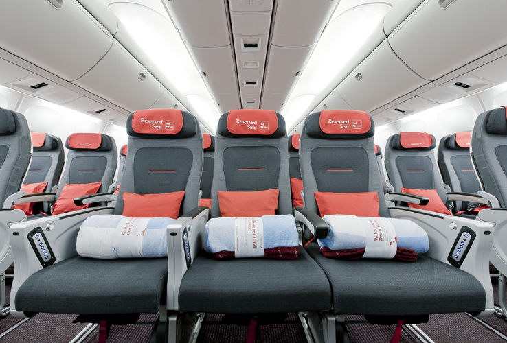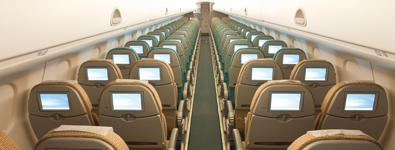 Kao najstandardnija konfiguracija se uzima 3+3 odnosno ABC+DEF. Slovni raspored zavisi od aviokompanije. Oznake sedišta se nalaze iznad a broj reda je bočno na pregradama za ručni prtljag.