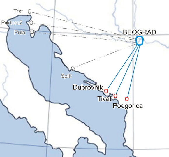 U vreme Jugoslavije, Beograd je bio povezan vazdušnom vezom sa svim gradovima duž primorja a pojedine linije su bile ubedljivo najprometnije u domaćem jugoslovenskom saobraćaju. Kao najjače linije isticale su se Beograd-Split i Beograd-Dubrovnik. Sa raspadom Jugoslavije, ove linije prestaju da postoje ali tada nagli procvat doživljava ruta između Beograda i Crne Gore (aerodromi Podgorica i Tivat). Skoro pola miliona putnika leti godišnje na ovoj liniji što čini polovinu ukupnog putničkog prometa na dva crnogorska aerodroma.