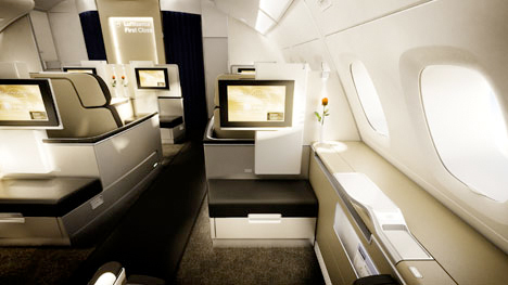 Prva klasa se razlikuje u zavisnosti od tipa aviona. Na sledećim linkovima možete pogledati detalje svih postojećih kabina prve klase kod Lufhanse: