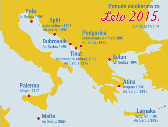 Nama najjeftinije destinacije na Mediteranu su nam i najbliže. To su gradovi na crnogorskom i hrvatskom primorju do kojih postoje direktni letovi iz Beograda u okviru redovnog aviosaobraćaja, ali je tokom udarne letenje sezone do tamo veoma teško pronaći slobodno mesto, pa su i cene karata za takva mesta po pravilu veoma visoke.