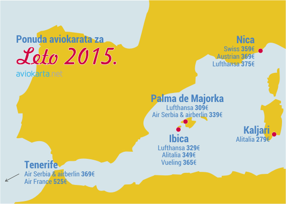 Izuzetno popularne destinacije Zapadnog Mediterana poput Nice (Azurne obale), Palma de Majorke ili Ibice najpovoljnije se mogu dosetiti uz aviokarte Lufthanse, SWISS-a ili Austriana. Za Nicu treba izdvojiti najmanje 359 evra za let preko Ciriha, za Palmu 309 evra preko Nemačke, a za Ibicu 329 evra.