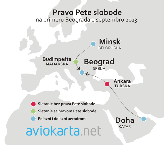 Qatar Airways ima od Mađarske dodeljeno pravo Pete slobode na svojoj ruti Doha-Budimpešta-Zagreb, ali nema ovo pravo u Turskoj za svoju liniju Doha-Ankara-Beograd tako da u tom slučaju ne može da prevozi putnike između Ankare i Beograda, već se sletanje u Ankari smatra tehničkim sletanjem.