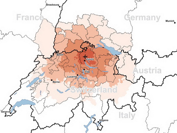 Mapa: Udaljenost od ciriškog aerodroma; od 30 minuta vožnje (najtamnije) do 90-120 minuta vožnje (najsvetlije)