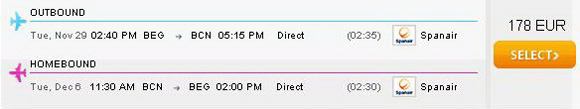 Sajt ove kompanije kao rezultat pretrage letova između Beograda i Barselone pokazuje neverovatno visoku cenu. Po sajtu ove kompanije najjeftinija povratna karta se može kupiti za 1300 evra ili 658 evra za kartu u jednom pravcu.