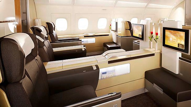 U prvoj klasi se ne nalaze standardna sedišta već su to sedišta najnovije tehnologije koja se veoma jednostavno pretvaraju u pravi pravcati krevet (rasklapaju se pod uglom od 180 stepeni). Sedišta su ograđena posebnim pregradama u okviru koji se nalaze i zasebni audio-video uređaji kao i prikljuci za internet tokom leta.