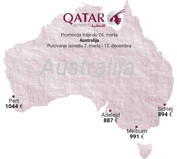 Dragi putnici, prijatelji, globtroteri, kupci – naš i vaš Qatar Airways nam je pružio priliku kakvu do sada nismo imali – Australija za manje od 1000 evra! Sidnej je na ovoj promociji samo 894 evra !!! Melburn je 991 evro, Adelejd 887 evra, Pert 1044 evra, sve takse i prtljag su uključeni u cenu.