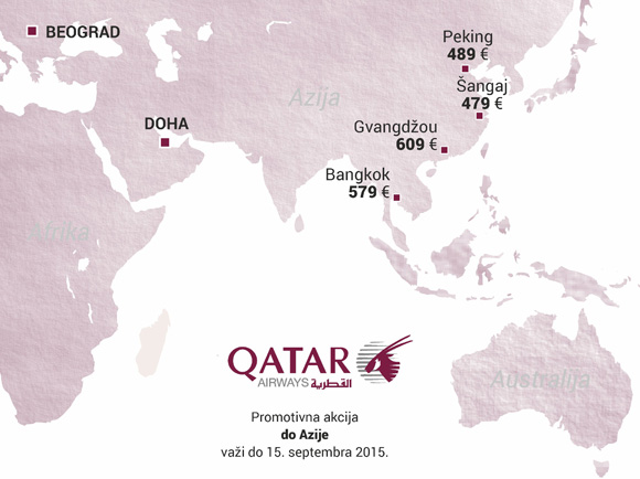 Do 15. septembra Qatar Airways nudi karte za Bangkok, Peking, Šangaj i Gvangdžou po izuzetnim cenama. Putovanje mora da se završi do kraja marta naredne godine. Promocija ne važi samo za period od 18. decembra do 10. januara.
