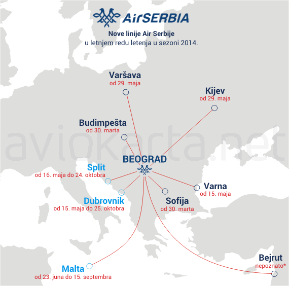 Air Serbia će leteti ka Dubrovniku tri puta nedeljno, od 15. maja do 25. oktobra i ka Splitu takođe tri puta nedeljno, od 16. maja do 24. oktobra. Obe ove linije održavaće avioni ATR 72-200. Od 13. juna Air Serbia će leteti i ka Malti i to dva puta nedeljno. Letove će sve do 19. septembra obavljati avioni Airbus A319.