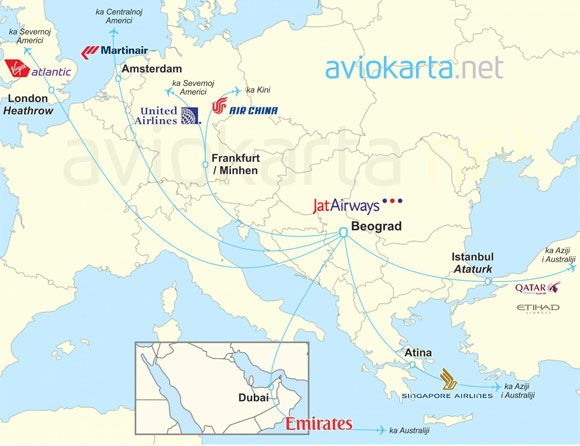 Na ruti između Srbije i Australije ni jedna aviokompanija ne leti u celosti. Kako Jat Airways leti do gradova iz kojih neke druge aviokompanije lete do Australije onda se Jat Airways i, na primer, Emirates dogovore o zajedničkom prevozu putnika između Beograda i Sidneja preko Dubaija. Jat doveze putnike do Dubaija, gde ih preuzima Emirates i dalje nastavljaju putovanje ka Sidneju.