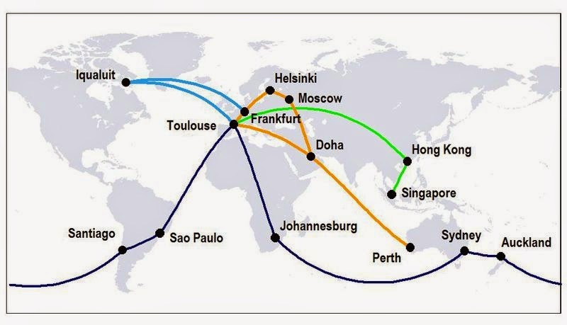 Tehničko testiranje ruta počelo je 24. jula u Tuluzu, u Francuskoj i obuhvatilo je sledeće destinacije: Frankfurt, Singapur i Hong Kong. Na trećem putu, letelica je posetila Johanesburg i Sidnej, nakon toga Okland, Santijago de Čile i Sao Paulo. Četvrto i poslednje putovanje je obuhvatilo Pert, Dohu, Moskvu i Helsinki.